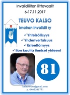 Imatran Invalidien puheenjohtaja Teuvo Kalso on valittu Invalidiliiton liittavaltuustoon. Teuvo sai Kaakkois-Suomen vaalipiiristä eniten ääniä ja kaikista vaalipiireistä Teuvo oli äänisaaliillaan viides! Teuvon valtti liittovaltuustossa on iloinen asenne, kehitysmyönteisyys ja innokkuus niin vaikuttamistyöhön, kuin erilaisten tempausten ja tapahtumien järjestelyyn. Teuvon vaalisloganin myötä, toivotamme Paljon Onnea! Ilon kautta ihmiset yhteen! |